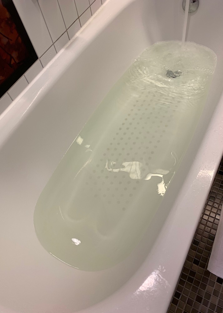 Kylpyvettä laskiessa paljastui kuitenkin odottamaton yllätys, kun allas täyttyi vihertävällä vedellä. Asiaa tutkittiin ja setvittiin pitkä tovi, mutta vaikka Hotel Scandic Potsdamer Platzin sisustus olikin hissin kattoa ja ruokasalia myöten koivun ja limenvihreää, ei selitystä hotellihuoneen kylpyammeen vihertävälle vedelle löytynyt. Hotelli tarjosi kyllä kuntosalin suihkua ja toista vapautuvaa huonetta seuraavana aamuna, mutta koskapa suihkun vesi näytti kuitenkin juomalasissa värittömältä, sai se kelvata pikasuihkuun helteisen päivän jälkeen. Suihkugeeli tosin kylpyhuoneesta uupui, mutta järjestyi myöhemmin. Seuraavana päivänä hotellin huoltomies ei löytänyt kylpyammeesta mitään korjattavaa eikä mitään siis korjattu.