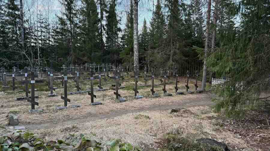 Seuraavassa kyltissä luki: Hautausmaalle, ja pian hiekkatien vasemmasta reunasta löytyikin puinen portti, joka oli koristeltu ortodoksisin symbolein. Astuin portista sisään ja näin lukuisan määrän puisia ortodoksisia ristejä vieri vieressä. Ne olivat kaikki toistensa kaltaisia, koruttomia ja eleettömiä. Kun niitä katsoi läheltä, löytyi puisista risteistä pieni laatta, jossa luki aina edesmenneen nimi, kuten pappismunkki Johannes, Konevitsan luostarista, s. 15.7.1884, k. 13.4.1964.