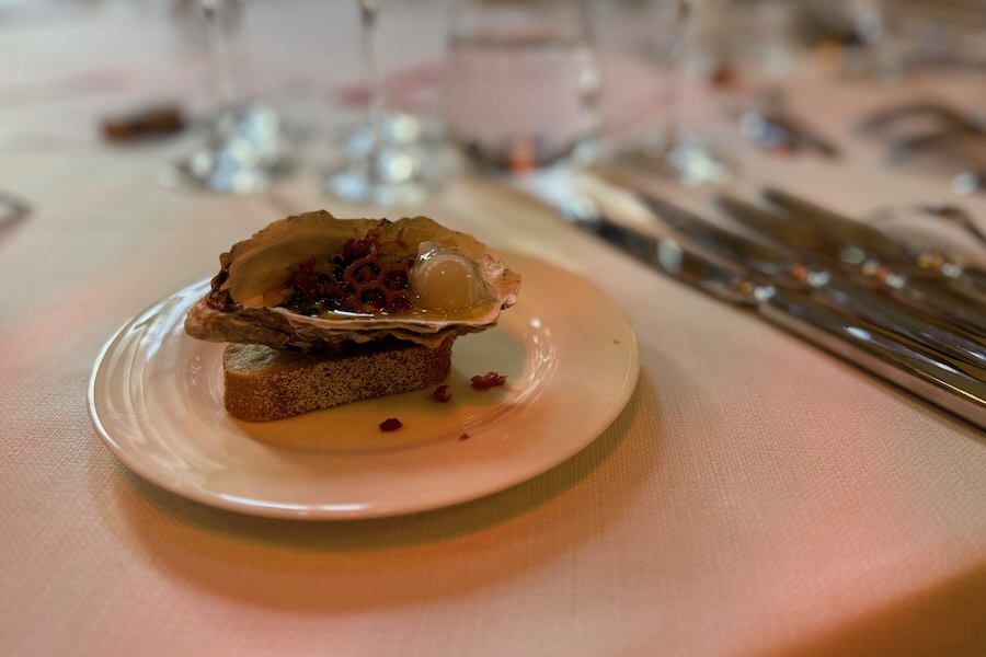 Pöydät oli katettu huolella: neljä haarukkaa, neljä veistä, kaksi lusikkaa ja useita viinilaseja jokaiselle. Tunnelma oli juhlava ja odottava. Olin innoissani, sillä edellisestä Michelin-tason ateriastani oli jo ehtinyt kulua jonkin aikaa. Sekin oli itse asiassa nautittu tämän saman hotellin yhteydessä toimivassa ravintolassa, kun sain aamiaisella kokea suomalaisen Michelin-kokin luoman version perinteisestä röpörieskasta.